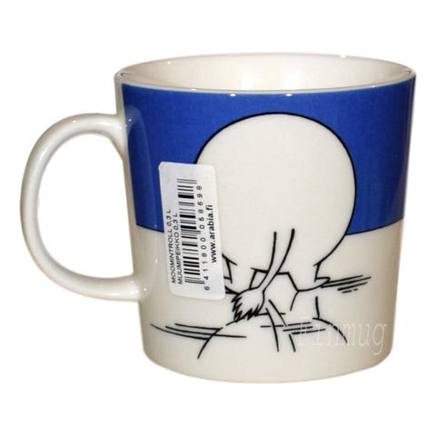 Vaikka mukin nimi on "Muumipeikko jäällä", on mielenkiintoista, että mukin tarrassa lukee vain "Muumipeikko-Sininen". Kuvitus antaa kuitenkin mukille nimen: Mukissa on kuvattuna sekä edestä että takaa, kun Muumipeikko tutkii jäätynyttä lampea. Muki on jo sen verran vanha, että tarralliset mukit ovat harvinaisia. Erityisesti "Made in Finland" -tarralla varustetut mukit ovat erittäin harvinaisia ja arvokkaita