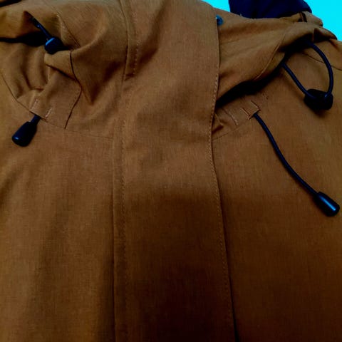 Hyväkuntoinen ja siisti parkatakki välikauteen. Aran värin vuoksi löytyy vähäistä tummentumaa esim. hihansuista. Muutama lähes näkymätön pieni jälki syynäämällä tuli myös huomattua, yksi taskun kohdalla, tästä kuva. Vyötäröllä ja helmassa kiristysmahdollisuus.