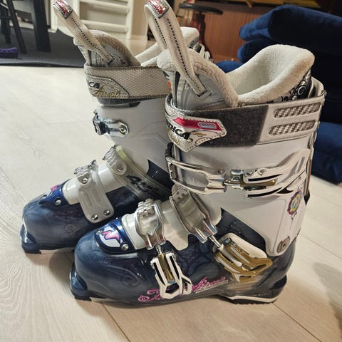 Nordica NXT 110 junnujen laskettelumonot valkoisena. Monot on varustettu neljällä metallisoljella ja tarrakiinnityksellä. Hyvä kunto, pinnassa pientä kulumaa ja pinttymää. Monon sisämitta/mondokoko 23-23.5 ja ulkomitta 275 mm. Vastaa kokoa 36,5-37.