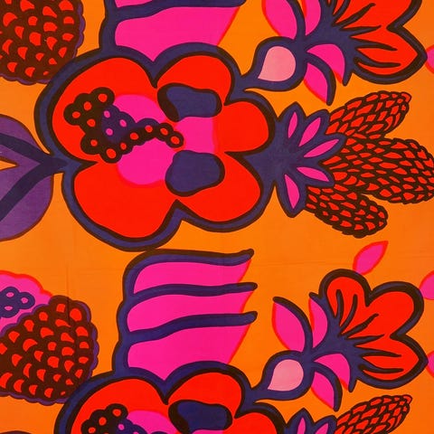 1970-luvun pöytäliina Marimekon Villikaali kuosia. Design Maija Isola.