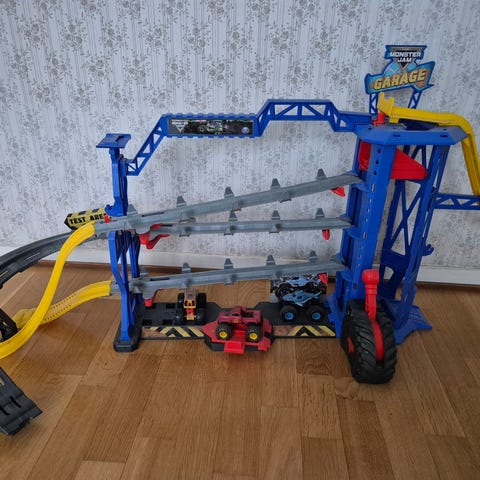 Pari vuotta vanha, vähän leikitty Monster Jam Garage autorata monsteriautoille.