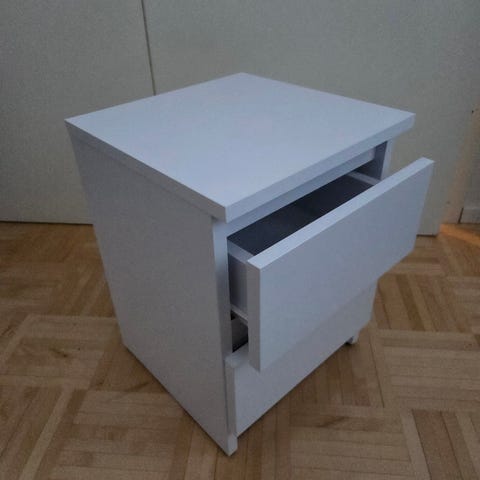 Valkoinen yöpöytä pienellä vetolaatikolla. Mahdollisesti Ikea, en ole aivan varma. Painava. Käytönjälkeä näkyy, mutta yleisilme siisti. Vetolaatikko välillä jumittaa, en tiedä saisiko kiskoja säätämällä toimivammaksi tai öljyämällä.