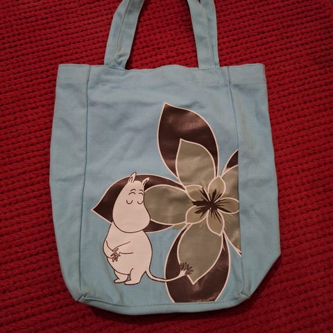 Moomin kangaskassit, mustalla ja turkoosilla tekstillä.