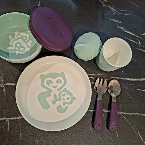 Kuvan mukainen paketti. 2 alustaa ja 2 ruokailulappua. Lusikoita kaupan päälle jos haluaa