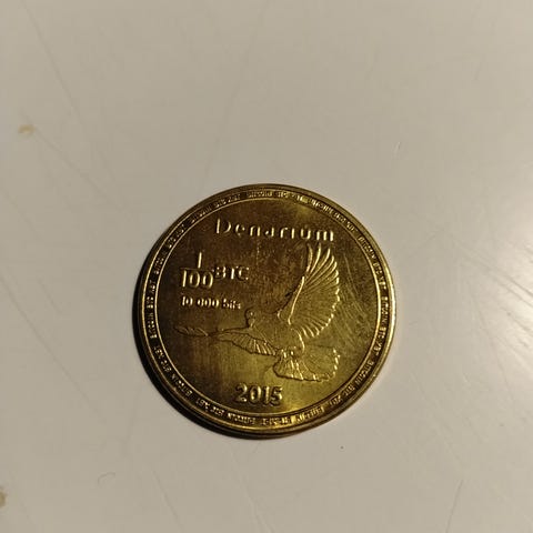 Tämä on Denariumin fyysinen, kullattu Bitcoin-kolikko vuodelta 2019 johon saa talletettua Bitcoinia.