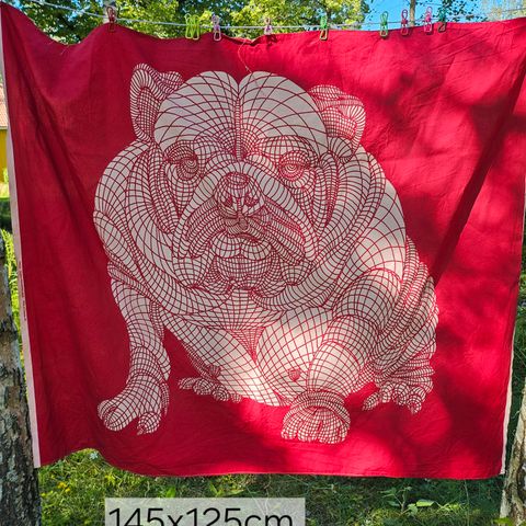 Koira- aiheinen gobeliini kangas 140x235cm. Hyväkuntoinen, siisti ja ehjä. Kauniit värit, second hand. Kuvattu pääsääntöisesti ulkona. Päät ommeltu.