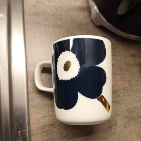 Marimekko juhla Unikko muki, jossa on sinivalkoinen kukkakuosi. Kullattu unikko. Ehjä ja siistikuntoinen, käyttämätön.