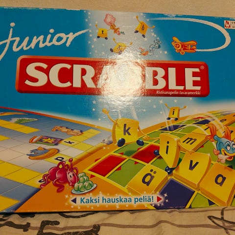 Scrabble Junior lautapeli, jossa on värikkäät kirjaimet ja pelilauta, suunniteltu lapsille sanapelin harjoitteluun.