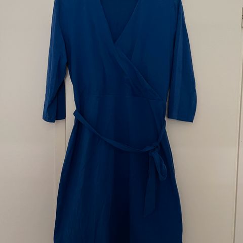 Sininen, valkokuviollinen mekko. Koko M/L. Rintataskut+ sivutaskut. Helmassa halkiot. Pituus 120 cm