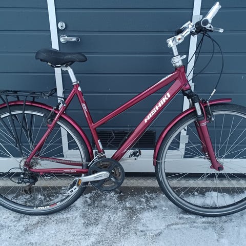 Hyväkuntoinen, huollettu 27-vaihteinen naisten hybridipyörä. Alumiinirunko. Vannejarrut. Hyvät pistosuojatut ulkokumit (takana uusi kumi). Uusittu kasetti, satula ja gripit. Renkaat 28". Runkokoko 43 cm (suositus yli 160 cm pituisille).