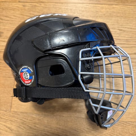 Hyväkuntoinen, lähes uutta vastaava, musta jääkiekkokypärä.