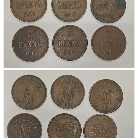 5 pennin kolikot 1896, 3e ja 1986, 2e