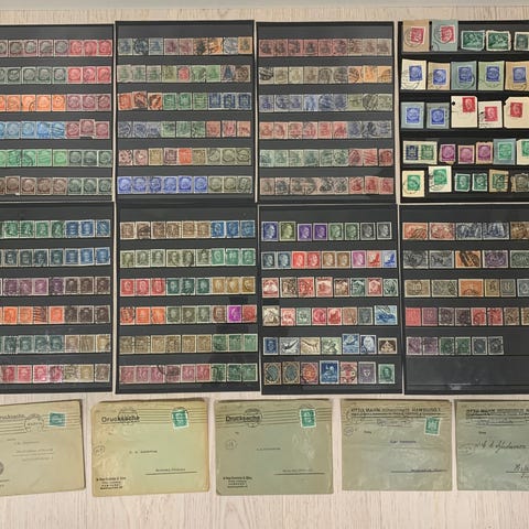 Olutlaatikollinen täynnä ja vähän ylikin saksalaisia postimerkkejä. Tuhansittain.