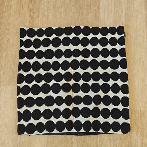 Marimekko räsymatto tyynyliina, jossa on punavalkoinen väritys ja perinteinen räsymattokuvio. Sopii sisustukseen ja lattian peittämiseen.