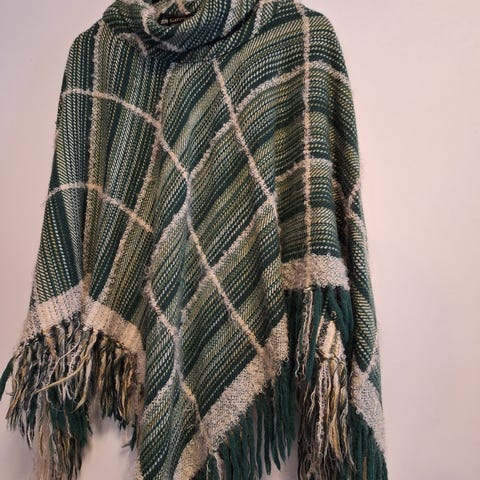 Turkoosin värinen poncho, design Pirkko Mäki (Arolan kutomo Toijala, made in Finland).