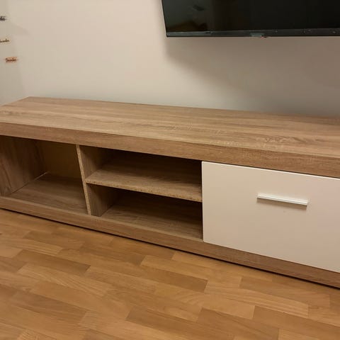 Tv-taso, mahdollisesti Ikean mutta en ole ihan varma. Tämä on ns nurkkamalli eli sopii hyvin esim nurkkan kolmio-mallinsa vuoksi. Siistissä kunnossa, jotain pientä elämisen jälkeä voi olla. Takaseinä avoin johdoille.