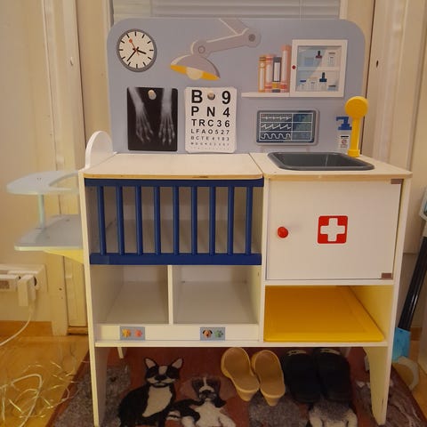 Myydään hyväkuntoinen ja siisti puinen eläinlääkäriasema / nuken lääkäri lasten leikkeihin. Mitat noin lev 77cm, kork 84cm, syv 33cm. Nouto Nokialta Viholasta.