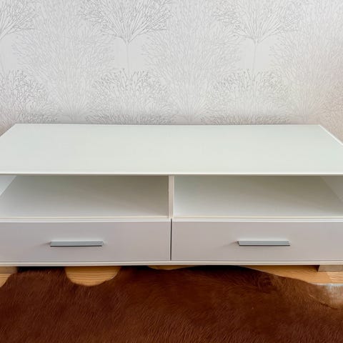 Muurame TV-taso. Leveys 235 cm, korkeus 43 cm, syvyys 42 cm. Siisti ja hyväkuntoinen. Keskimmäisen hyllyn ovesta kiinnityksen osa katkennut (katso kuva). Muuramelta voi ostaa/tilata varaosan. Luukku pysyy kyllä ylhäällä.