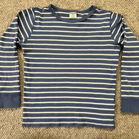 Raidallisia pitkähihaisia paitoja 4 kpl. Koko 128. Tummansinisessä merkintä 122/128, mutta saman kokoinen . Hyväkuntoisia tahrattomia. Keltaisen helmassa pieni purkauma, siitä kuva.