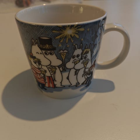 Myynnissä tuotannosta poistunut Arabian muumimuki Millenium. Käytössä ollu, alareunassa pieni lohkeama, mistä kuva. Pientä naarmua on. Mutta