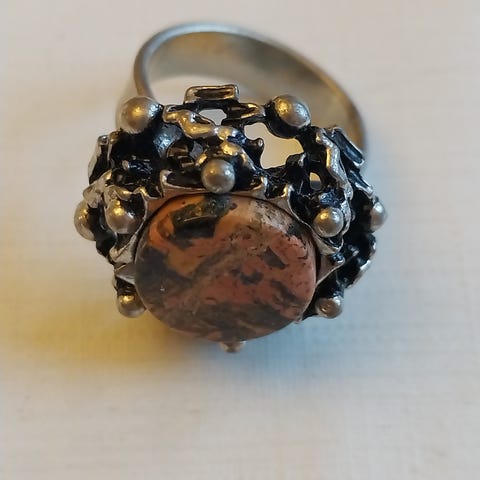 Jotain metallia ja kirkas kivi. Ei ole käytetty, en tiedä, mistä tullut. Ei ainakaan rautaa. Kotelo hukkunut.