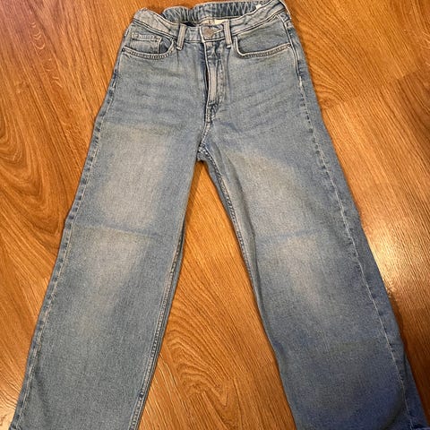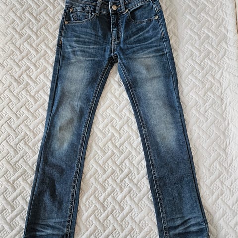Myyntiin yhdellä lapsella käytössä ollut ja meille uutena ostettu 128 cm farkut. Polvien kohdalla pientä kulumaa, muuten hyvässä kunnossa. Pinnassa kultaista glitteria, mikä kuvissa huonosti näkyy.