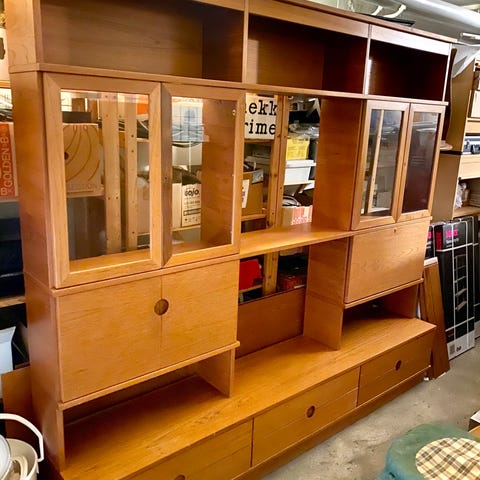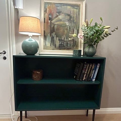 -60 luvun 2 osainen kirjahylly missä kirjoitusalusta