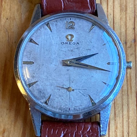 Vintage Omega vetokello tasaisella patinalla ja ikäisekseen vielä suht ok kultaus kuoressa. Halkaisija 34mm ilman nuppia. Veto ja ajanasetus sujuu vaivatta, kello edistää jonkun minuutin vuorokaudessa. Huoltohistoriaa ei tiedossa. Suositellaan huoltoa jos käyttökelloksi haluaa.