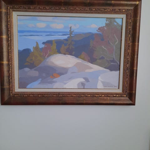 Maisemamaalaus, jossa on järvimaisema auringonlaskun aikaan. Kuvassa näkyy vene rannalla ja saari järvellä. Maalaus on kehystetty ja sopii sisustuselementiksi. Leveys 107,5 cm korkeus 57,5 cm. Vain nouto