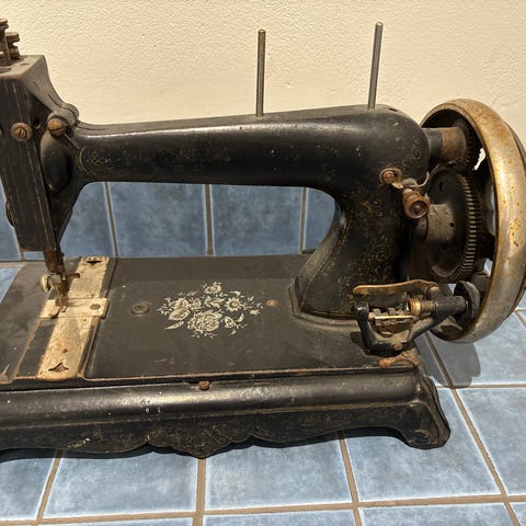 Saksalainen vanha lasten ompelukone. En ole testannut patteritoimintoa, mutta veivistä liikkuu neula ylös ja alas. Itse en ole kutonut tällä. Lähetyskuluineen 29 €.