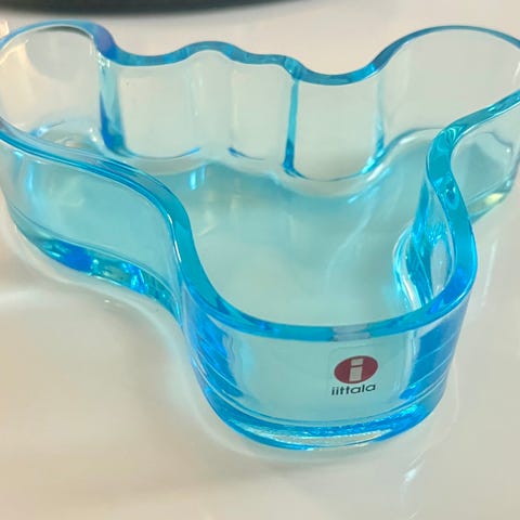 Iittala Aalto-malja vaaleansinisenä. Tulitikkuaski antaa koko osviittaa.