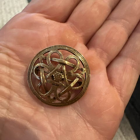 Myydään suomalainen design-pinssi “Lahti 75”, valmistettu vuonna 1975. Tyyliltään ajalleen tyypillinen modernistinen, käsityönä tehty.