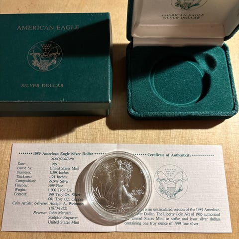 United States 2001 American Silver Eagle hopearaha, paino 1 unssi (noin 31,1 g), valmistettu 99,9 % hopeasta.