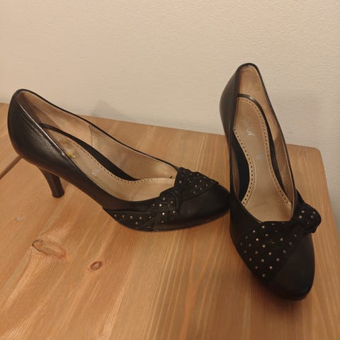 Nupukkinahkaiset mustat avokkaat koko 39-40. Pientä kulumaa. Kissatalous