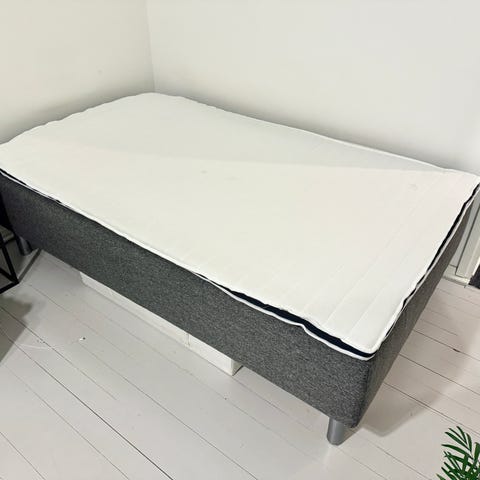 Hyvässä kunnossa oleva 120cm leveä sänky ja petauspatja. Sänky on väriltään tumman harmaa. Jalat ovat vaalean harmaat / hopeiset. Sängyn keskellä myös viides tukijalka.