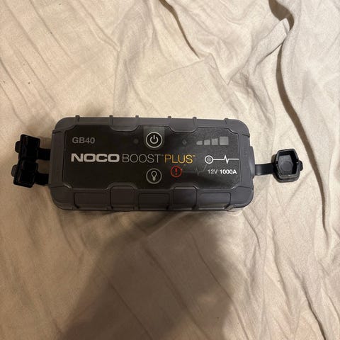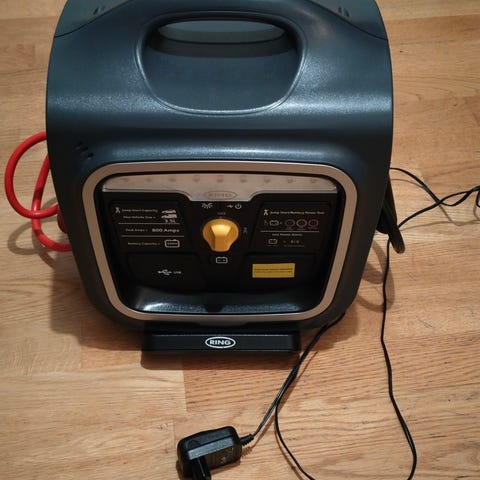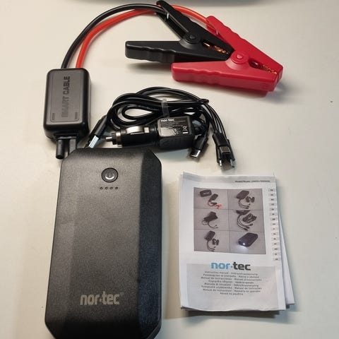 This is a Green Keeper GK-J1206P portable car jump starter with an air compressor and power bank.