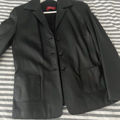 Tyylikäs ja laadukas 100 % aitoa nahkaa oleva bleiseri, vuori viskoosia. Oversize-malli, koko XS, mutta istuu hyvin myös S–M-kokoisille.