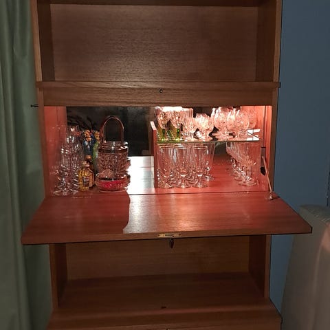 Valkoinen, 70-luvun hylly lukollisella baarikaapilla. Huom! Tavarat eivät kuulu kauppaan.
