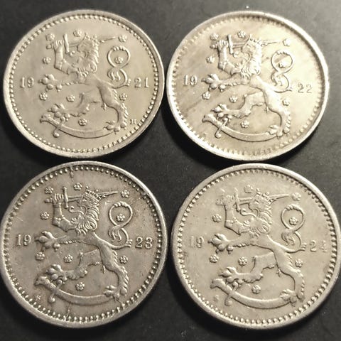 Kuvien kolikot, kaikki viimeisen markkamallin erilaiset, 9 eri vuotta. Lisäksi 1993 ei virallinen CuNi painos. Kaikki kulkemattomia rullista / vuosisarjoista. Klikkaa kuvat. Toimituskulut hyvin pakattuna kirjeenä 3,90 eur.