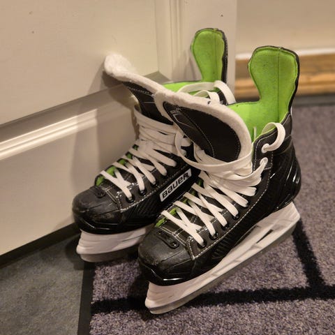 Myydään lasten luistimet. Luistimissa ei kokomerkintää mutta pohjallinen on 24cm joka bauerin sivujen mukaan viittaa kokoon 38.