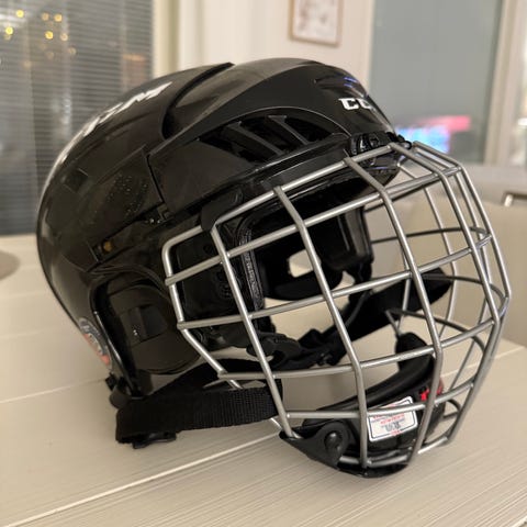 CCM FL40 jääkiekkokypärä musta, koko M. Kypärä on tarkoitettu jääkiekkokäyttöön ja siinä on irrotettava metallinen kasvonsuojaristikko (nyt irroitettuna) Kypärässä on ilmanvaihtoaukot ja säädettävä leuka- ja niskahihna. Sisäpuolella pehmusteet. Nouto Kangasalan Huutijärveltä.