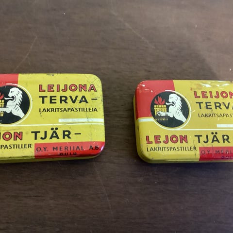 Suoraan 50 vuoden takaa sokeriton Vihreä Leijona karkkiaski Merijalilta Oulusta. Jopa sisäpaperit tallella. Ei uudenveroinen tietenkään.