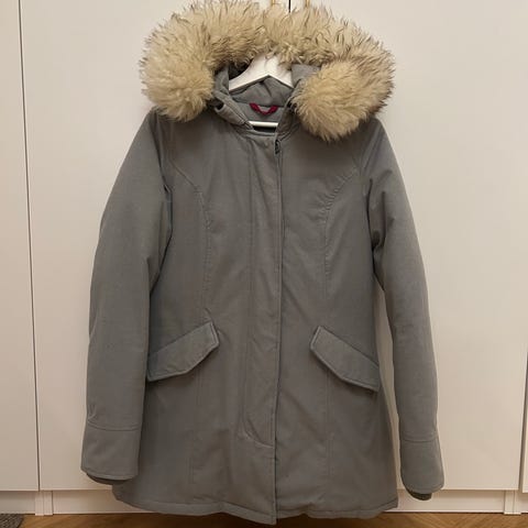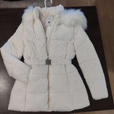 Uusi, käyttämätön takki karvakauluksella ja karvavuorella. Hihansuissa resorit, hupussa ja vyötäröllä kiristysnauhat. Ulkopuolella edessä rintataskut nepparikiinnityksellä. Päällinen puuvillaa, karvavuori polyesteriä.