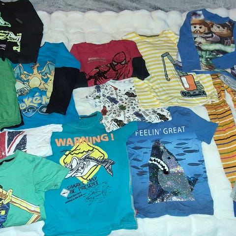 Vaatteita mm. Everest-fleece setti, Reiman sadetakki, Viking-lenkkarit, Bogi-softshell housut. Lindex-kevättakki vaaleansininen. Farkut, hupparit Adodas+Converse, reppu.