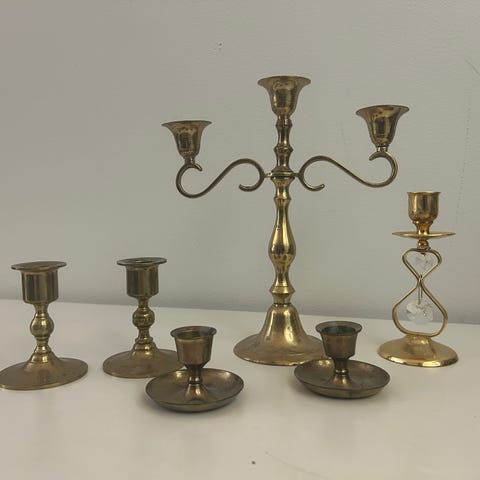 Myynnissä tukevat messinkiset kynttilänjalat, jotka ostettu vintagemyyjäisistä. Hyvä kunto pienellä ajan patinalla. Ei tule itse poltettua kynttilöitä. Uudet siniset kynttilät saat halutessasi kaupan päälle :)