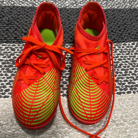 Adidas jalkapallokengät, värit valkoinen, punainen ja sininen, koko 29. Kengissä on nauhakiinnitys. Yhden kauden käytössä olleet yhdellä lapsella. Sisämitta 17.5cm