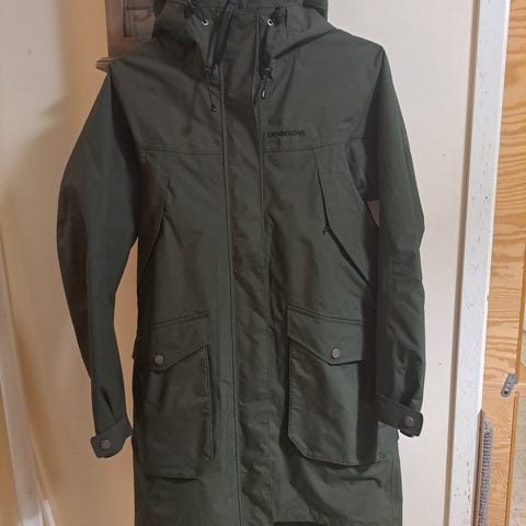 Yhden talven käytössä ollut reilukokoinen parkatakki. Koko 36, vastaa 38. Hihoissa ranneneulokset, ulkoinen povitasku, kiinteä lämmin huppu, kaksitoiminen vetoketju ja tuulilista edessä. Kosteuden pitävä. Takki on pesty, mutta meillä on koira talossa. Pieni kosmeettinen virhe kankaassa edessä, mutta jää tuulilipan alle. Nouto tai postitus ostajan piikkiin.