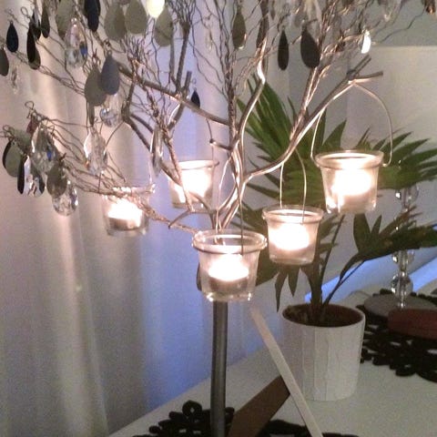 Pentikin hopeanvärinen puu, jossa 4 tuikkukuppia. Korkeus n.68 cm.