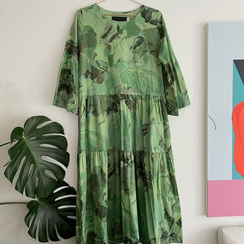 Vimman ihana luottomekko herkullisen kirjavana, materiaalina joustava jersey. Koko L, mutta vastaa mielestäni samaa mitoitusta kuin uudempien Kalla II -mekkojen XL (ostin sellaisen juuri ja istuvat yhtä passelisti XL-kokoiselle).