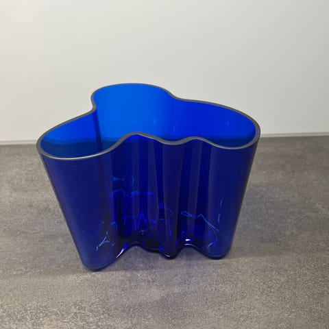 Iittala Alvar Aalto maljakko sininen lasia. Maljakon muoto on aaltoileva ja se on suunniteltu kukkien tai muiden koriste-esineiden esillepanoon. Väri on syvän sininen.